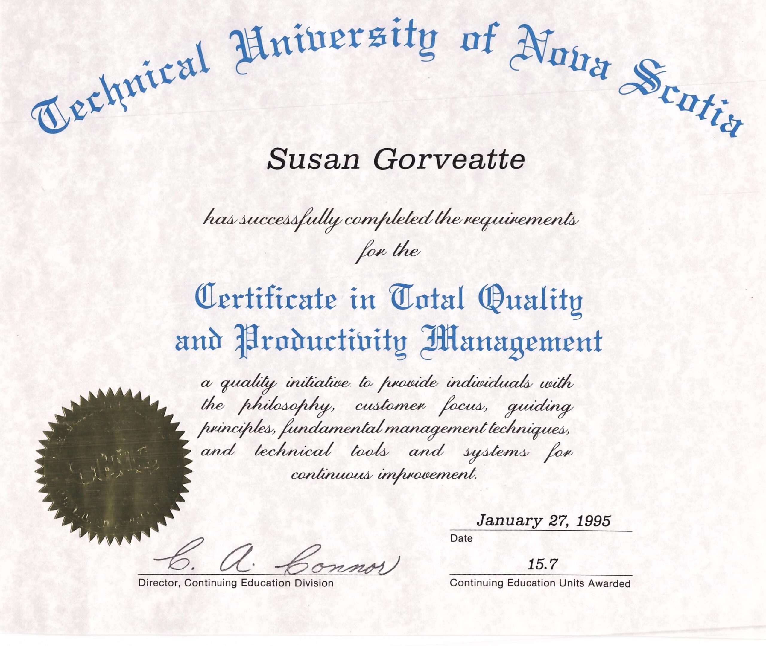 Susan has earned a Bachelor of Commerce in Entrepreneurial Management, a Small Business Management Diploma, and a Certificate in Total Quality and Productivity Management.